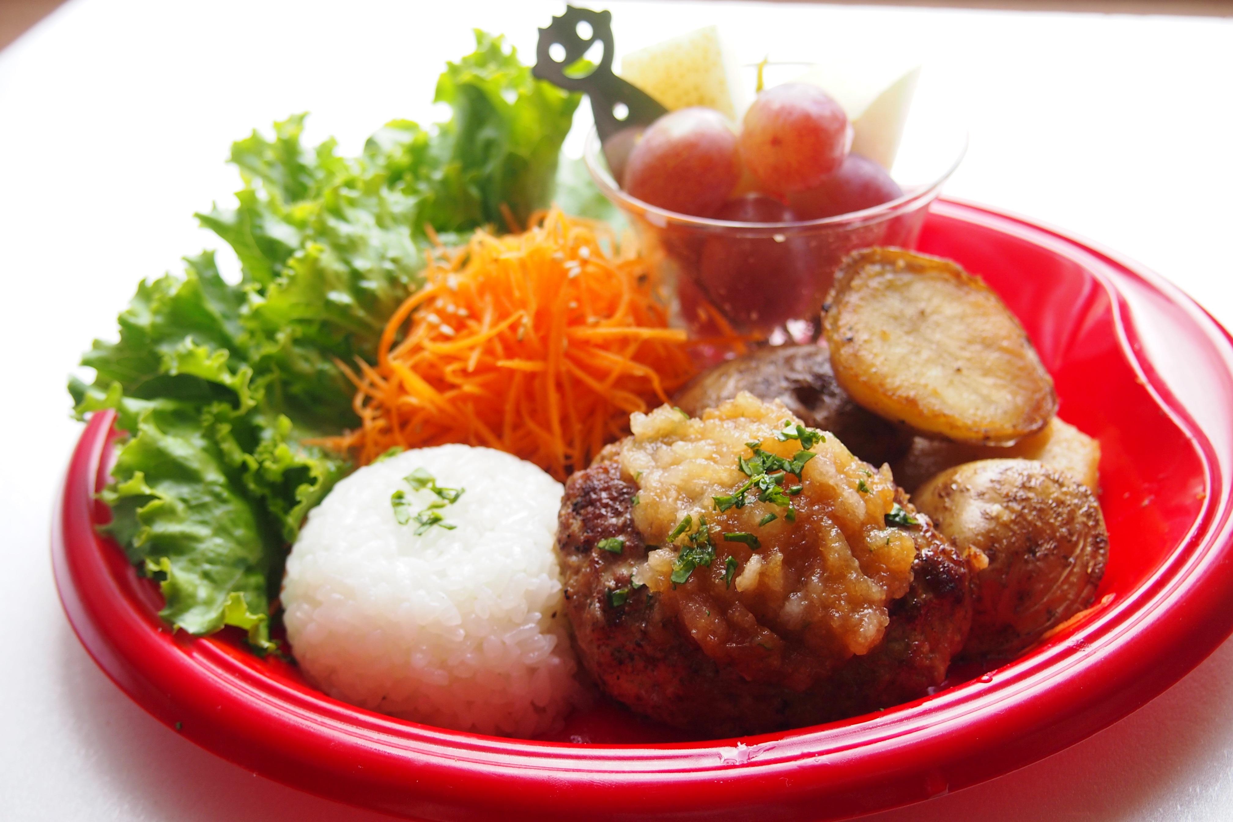 鳥取県産の牛肉と豚肉を使って「手ごねハンバーグ」を、同じく鳥取県産の二十世紀梨を使って「オリジナルハンバーグソース」を作りました。